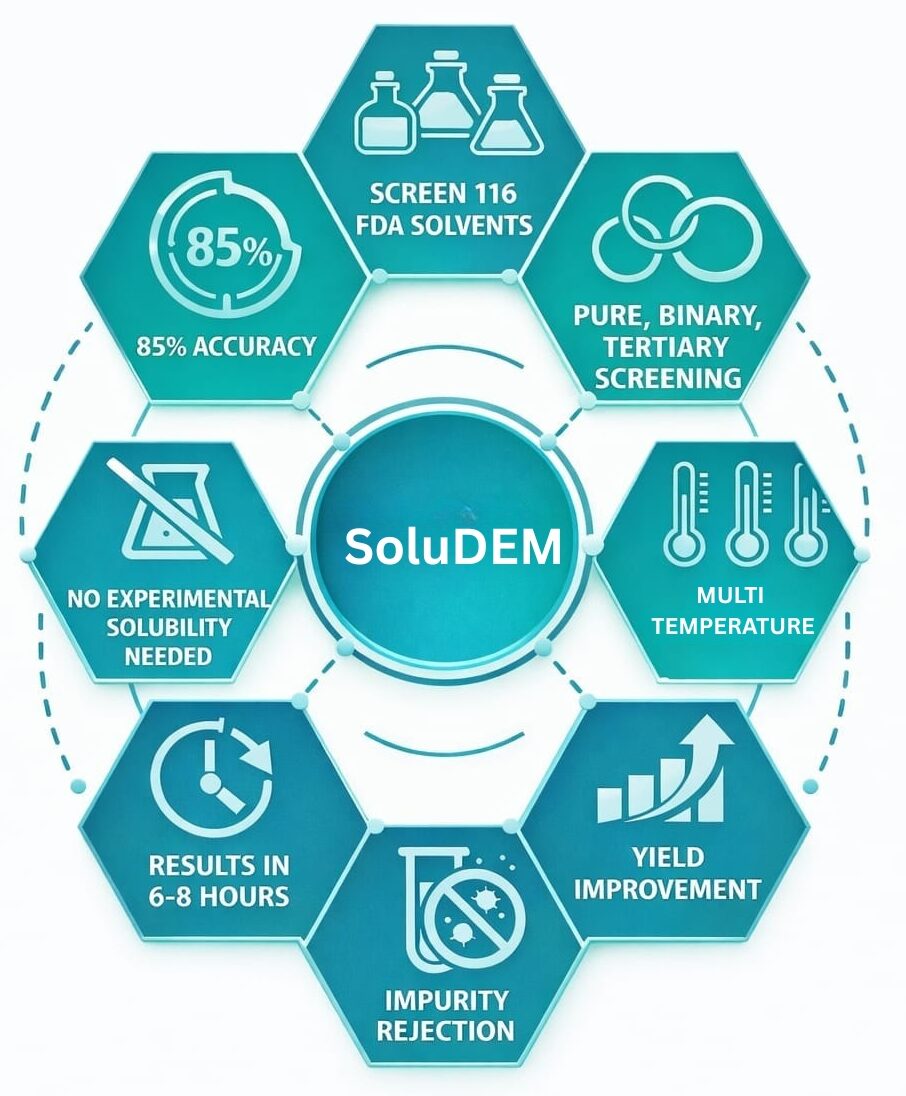 Using predictive solubility modelling, SoluDEM identifies solvent systems that: